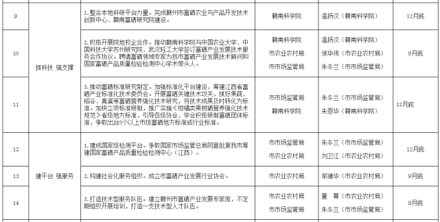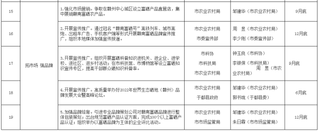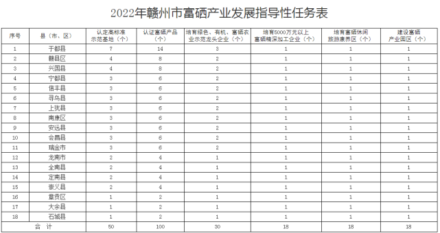 根據方案,我市在2022年通過加強富硒土壤資源保護與開發利用,發揮首批富硒產業示范基地帶動作用,新建高標準富硒產業示范基地50個以上;按照“擴大總量、提檔升級、特色鮮明、示范帶動”的總體要求,結合富硒農業產業發展實際,集中優勢資源,推動建設18個高標準富硒產業園區;突出綠色有機富硒農業資源優勢,出臺獎補政策,重點培育30個集生產、加工、銷售和三產融合于一體的富硒農業示范龍頭企業;完成贛州市富硒農業與產品開發技術創新中心、贛南富硒研究院建設,啟動富硒功能產品研發、富硒功能農業大數據中心建設,開展硒與動物和人體健康國際計劃合作研究,不斷提高新技術、新產品示范推廣能力和科研成果轉化率,通過硒科技創新驅動硒產業高質量發展;組織富硒農產品參加各地展示展銷活動,推廣贛南富硒;實施強農戰略,引進策劃公司對贛南富硒進行整體包裝策劃等內容,做好硒資源的有效保護和合理利用工作。