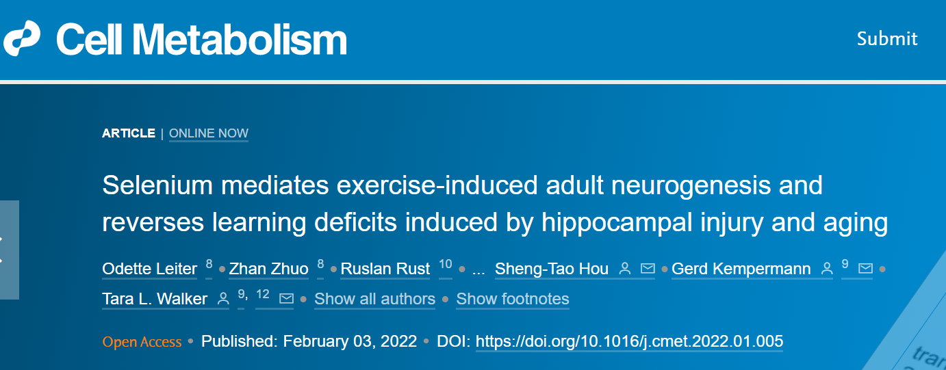 硒作為一種必不可少的營養(yǎng)微量元素,也是我們飲食的重要組成部分。近期,昆士蘭大學(xué)發(fā)表了研究,發(fā)現(xiàn)硒可以逆轉(zhuǎn)中風(fēng)對認知的影響,并提高衰老大腦的學(xué)習(xí)和記憶能力。相關(guān)研究發(fā)表在《Cell Metabolism》上,題為“Selenium mediates exercise-induced adult neurogenesis and reverses learning deficits induced by hippocampal injury and aging”。
