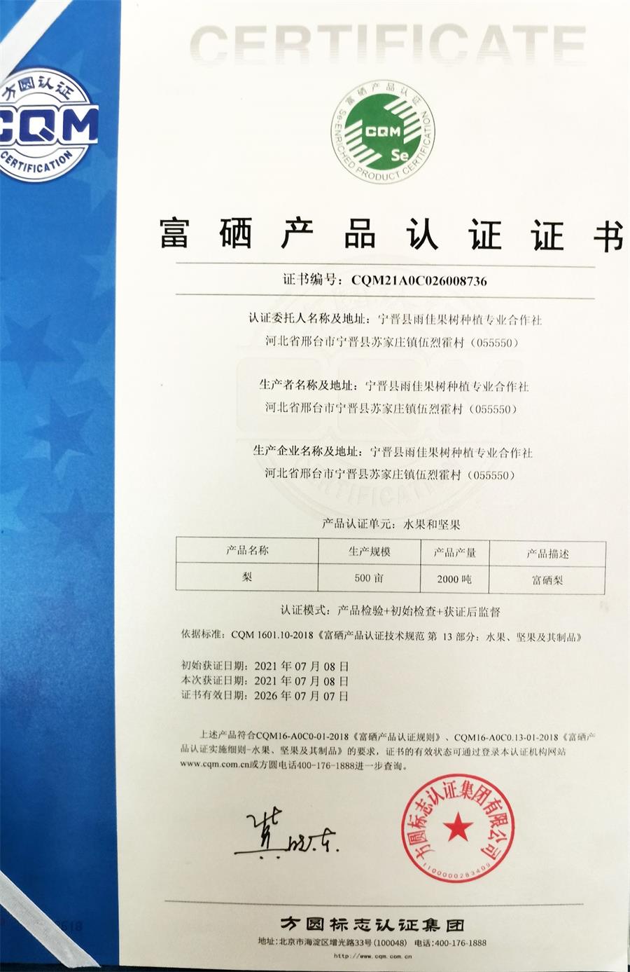 富硒梨認(rèn)證證書
