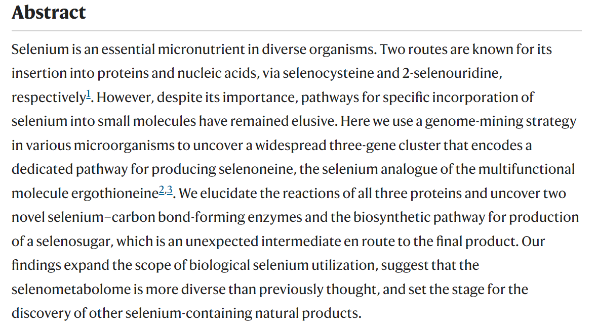 1. Chase M. Kayrouz et al. Biosynthesis of selenium-containing small molecules in perse microorganisms. Nature, 2022, doi:10.1038/s41586-022-05174-2.